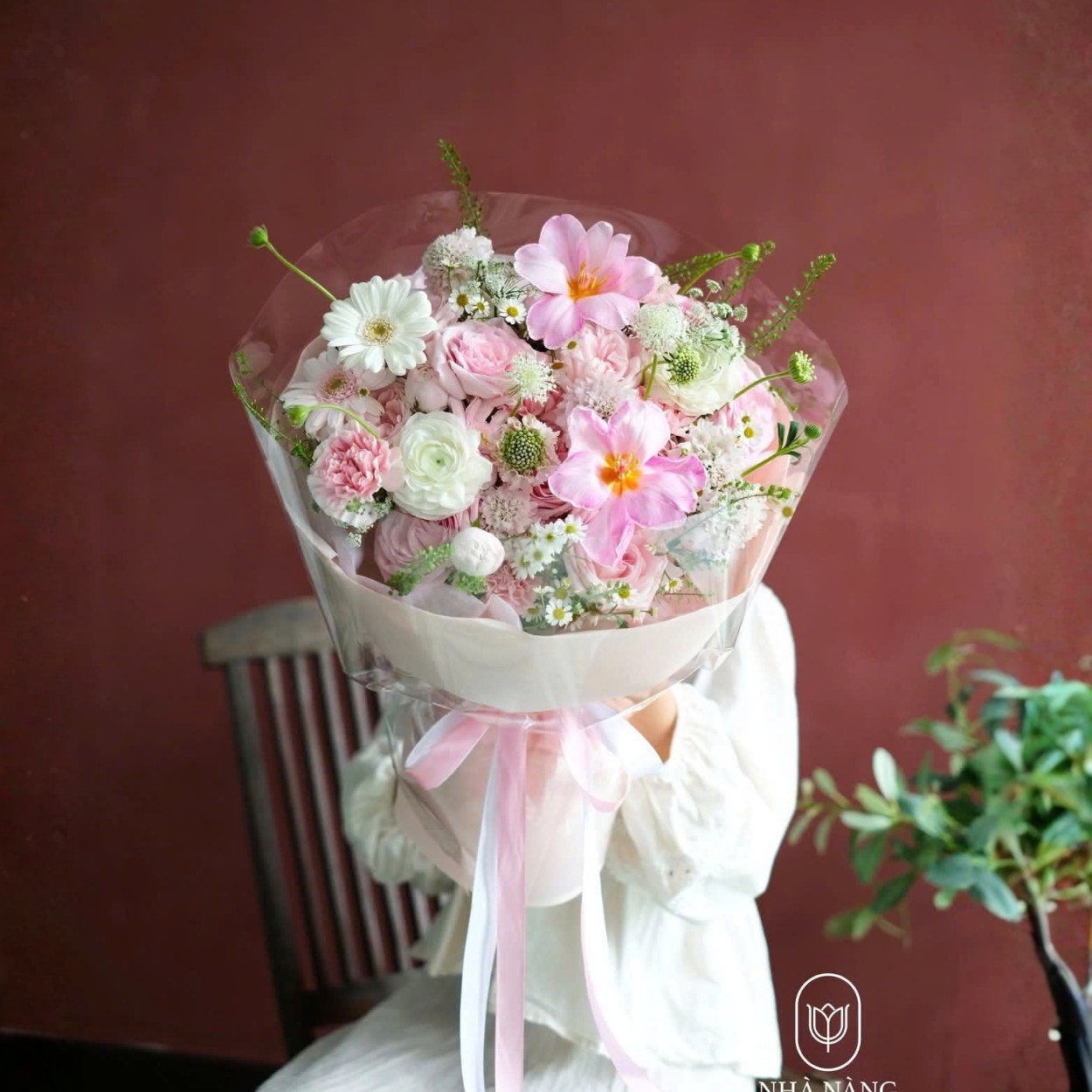Giấy gói trong suốt kết hợp cùng lớp giấy pastel nhạt giúp giữ trọn màu hoa bên trong, không che lấp mà chỉ nâng đỡ. Nơ lụa mềm, buộc tay vừa phải, để bó hoa giữ được nét tự nhiên, không quá “trang trí”.