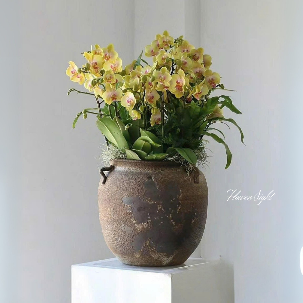 Tên gọi Ocean Wave Orchid gợi nhắc đến hình ảnh sóng biển dịu dàng, nhịp sống thư thái và vẻ đẹp tươi mới. Chậu hoa kết hợp Hoa lan hồ điệp vàng với gốm tạo nên tổng thể sang trọng, hài hòa và tinh tế. Mỗi cành hoa như lời chúc may mắn, niềm vui và thịnh vượng dành cho người nhận, đồng thời mang đến vẻ đẹp lâu bền cho không gian sống.
