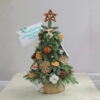 Olivia là “nàng thông” nhỏ gọn nhưng tinh tế: một thiết kế tối giản theo phong cách rustic, tập trung vào chất liệu tự nhiên và độ tương phản màu sắc. Trên nền lá thông tươi xanh, những điểm nhấn ấm – lạnh được phối có chủ ý: ánh bạc của trái châu phản chiếu nhẹ nhàng, vàng mật cam sấy làm bừng sáng tổng thể, nâu gỗ của trái thông và ngôi sao đỉnh tạo cảm giác mộc mạc, còn bông gòn trắng mang đến chút “tuyết” mềm. Toàn bộ đặt trong chậu quấn vải bố, hình khối vững và gọn, hợp bày ở bàn tiếp tân, kệ console hay góc làm việc. Olivia sinh ra để khiến không gian bình thường trở nên có câu chuyện – gần gũi, ấm áp và rất mùa đông.
