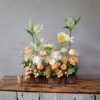 Trục thị giác của “On My Way” được dựng bằng hai búp hoa ly vươn cao, tạo cảm giác thanh khiết và mở không gian theo chiều dọc. Ở tầng trung, hoa hồng cam phớt – hồng phấn xen đồng tiền vàng và tulip thanh mảnh tạo nhịp chuyển mềm mại, kết nối khối hoa với mảng trái cây bên dưới. Thúy châu và cụm hoa trắng nhỏ đóng vai trò “ánh sáng mềm”, làm dịu tổng thể. Phần lá phối thiên về chất liệu mảnh – thoáng như lá bạc (eucalyptus), lá dương xỉ non và vài nhánh xanh đậm để khoá nền, giúp các tông pastel nổi bật mà không chói.