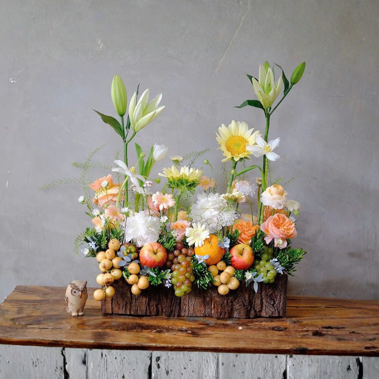 Bạn nhìn thấy gì đầu tiên? Là những nhịp màu tươi rói đang “dẫn lối” ánh nhìn: đỏ hồng của táo, cam chín căng mọng, chùm nho ánh mật, dâu da vàng óng và điểm xuyết măng cụt tròn xinh. “On My Way” được thiết kế như một khung cảnh nhỏ giữa vườn – nơi trái cây và hoa trò chuyện bằng màu sắc và chất liệu, tất cả nằm gọn trong hộp gỗ vỏ lũa mộc mạc, tạo cảm giác ấm áp, gần gũi mà vẫn rất thời thượng.