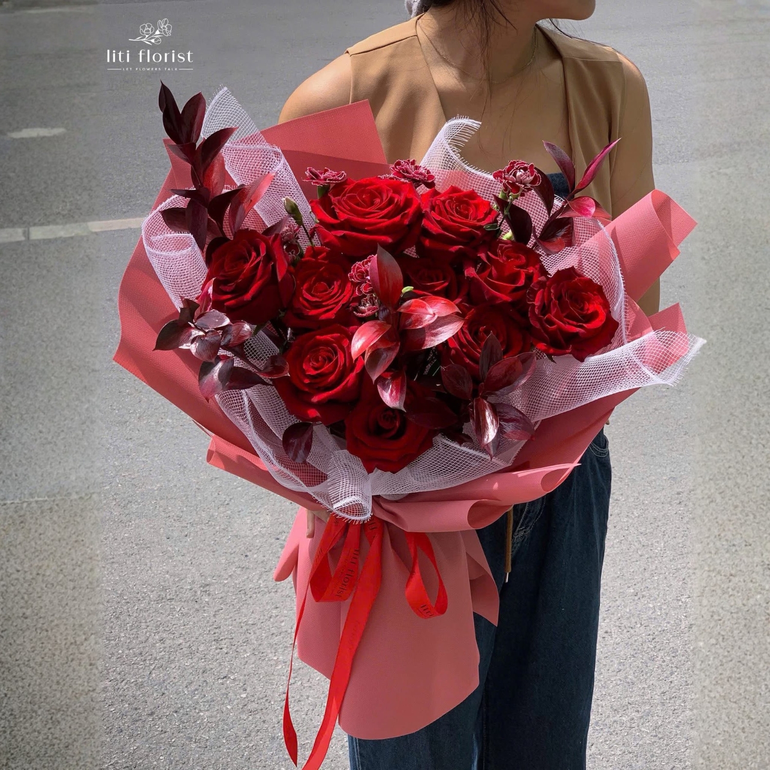 Lớp giấy gói được phối giữa tông hồng đất và lưới trắng, mang lại cảm giác mềm mại nhưng vẫn giữ được độ đứng form. Chiếc nơ đỏ buộc nhẹ phía dưới như một điểm nhấn cuối cùng – đơn giản, nhưng khiến tổng thể trở nên hoàn chỉnh.