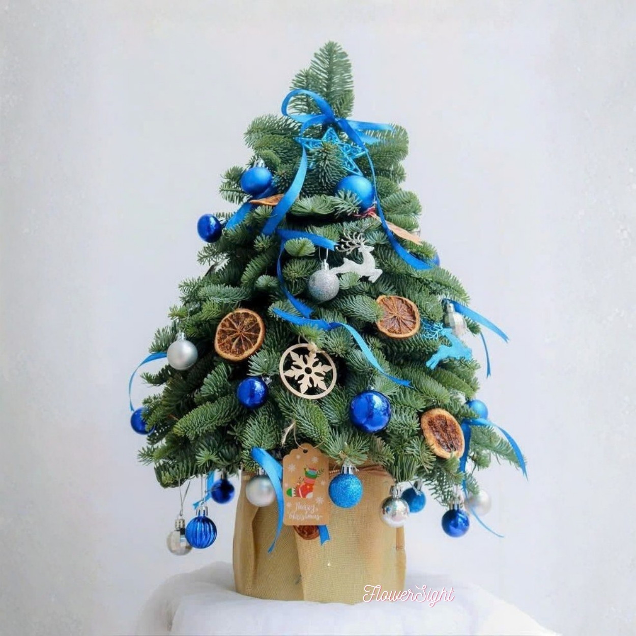Chất liệu chủ đạo là lá thông tươi bản kim dày, xếp tầng từ chân lên đỉnh để giữ phom chắc và che kín khung cắm. Trên nền xanh mát, các trái châu xanh cobalt – bạc – trắng được rải theo nhịp 2–3–1 tạo điểm bật thị giác, giúp ánh đèn phòng phản chiếu lấp lánh. Lát cam sấy màu hổ phách được cài vào các “ô cửa” giữa tán, bổ sung gam ấm và mùi thơm dịu tự nhiên. Những chi tiết gỗ như bông tuyết, tuần lộc treo nhẹ ở cao độ khác nhau, đem lại cảm giác thủ công mộc mạc và tinh nghịch. Đỉnh cây buộc nơ ruy băng xanh, giúp đường nhìn khép lại gọn gàng. Toàn bộ đặt trong chậu chắc chắn, bọc giấy bố màu cát, mép gấp bản lớn để tôn texture tự nhiên.