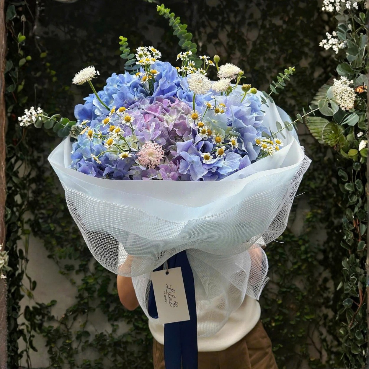 Bó hoa này không cố kể một câu chuyện lớn. Nó giống một lời nhắn nhỏ: mọi thứ rồi sẽ ổn. Cẩm tú cầu tượng trưng cho sự chân thành và biết ơn; khi đi cùng cúc tana và lá bạc, cảm xúc trở nên nhẹ, thoáng và bền. Bạn sẽ thấy đây là kiểu hoa càng nhìn càng dễ chịu: không phô trương, không gây áp lực phải “wow”, mà khiến người nhận muốn đặt xuống bàn, ngắm một lúc, rồi mỉm cười.