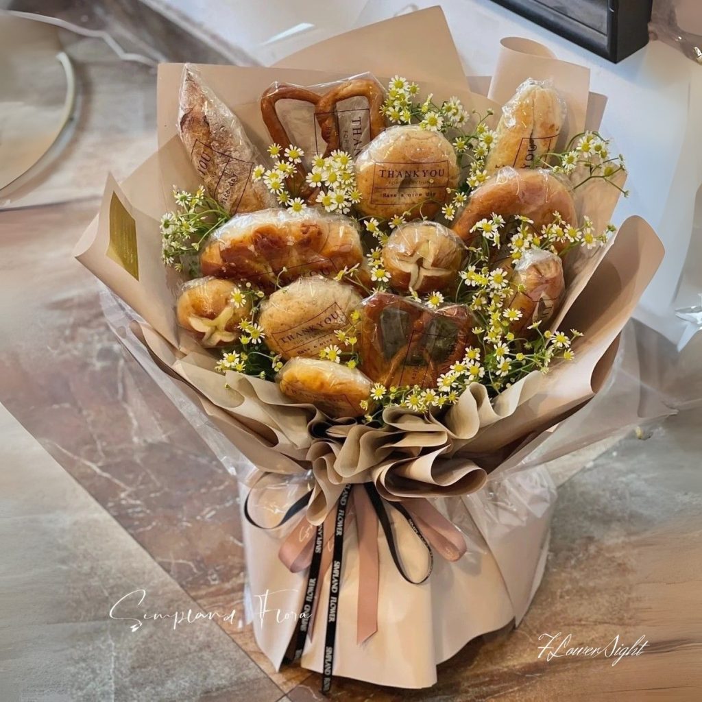 Peachy Peeps dùng kỹ thuật xếp tầng: bánh dài tạo trục dọc, bánh tròn và bánh hình bím tạo các “điểm neo” thị giác ở vành ngoài, giúp bó đứng phom tự nhiên. Mảng sáng của bánh đối thoại cùng nền nâu trầm, tạo hiệu ứng tương phản ấm áp. Lớp giấy kính trong suốt không chỉ bảo vệ thực phẩm mà còn mang lại độ bóng nhẹ như phủ sương, khiến bề mặt bánh hấp dẫn hơn dưới ánh đèn. Điểm xuyết những đóa nhỏ trắng vàng như cúc tana giúp tổng thể bừng sáng, làm nhiệm vụ “hoa điểm nhấn” để bó bánh vẫn giữ tinh thần một bó hoa đúng nghĩa. Cách tổ chức không gian này tiếp nối tinh thần hài hòa và nhấn nhá chi tiết thường gặp ở các mẫu thiết kế nghệ thuật của shop.