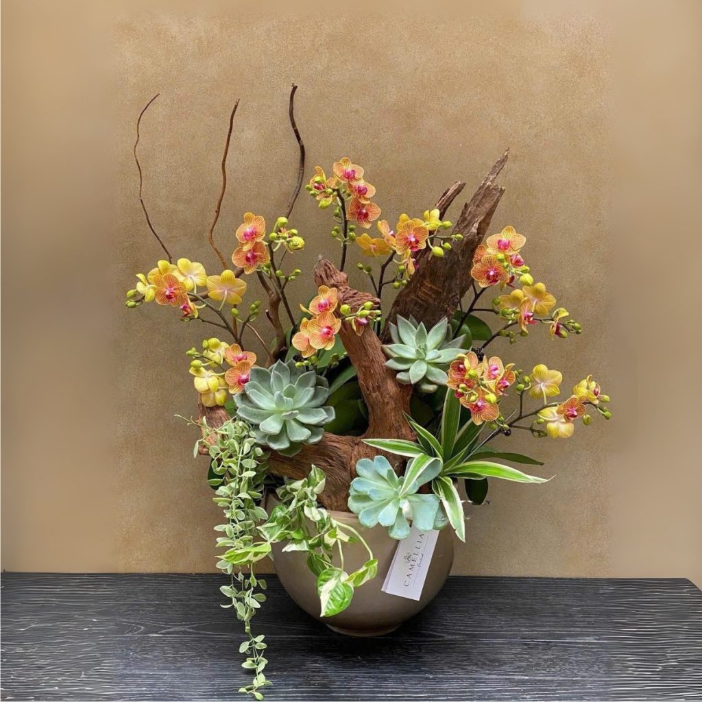 Từng chi tiết từ lan, gỗ lũa, sen đá đến dây nho đều được sắp xếp hài hòa, tạo tổng thể cuốn hút. Chậu hoa không chỉ làm đẹp không gian mà còn lan tỏa năng lượng tích cực, mang niềm vui và cảm giác hạnh phúc cho người nhận.