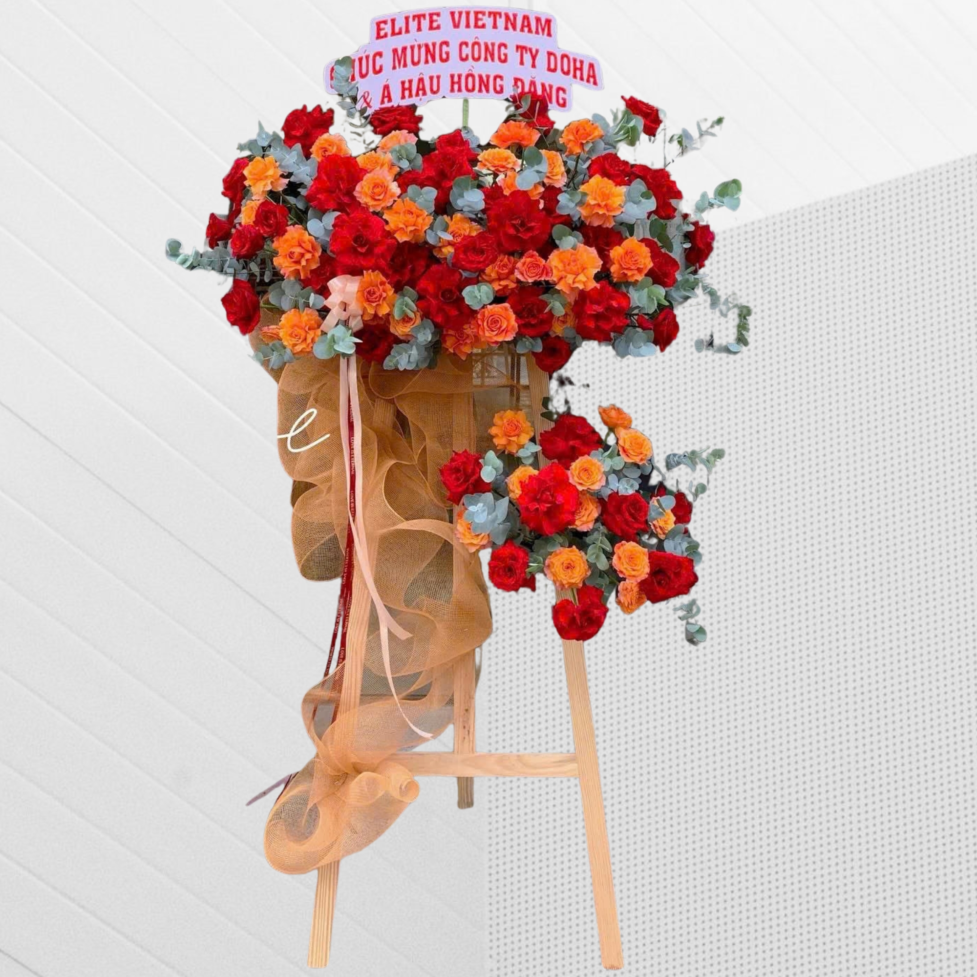Thiết kế kệ hoa mang tinh thần hiện đại, phóng khoáng nhưng vẫn giữ được sự cân đối nhờ bố cục tầng rõ ràng. Từng cụm hoa được sắp xếp có nhịp điệu, tạo hiệu ứng thị giác mạnh mẽ mà không bị rối mắt – một đặc trưng quan trọng trong nghệ thuật cắm hoa khai trương chuyên nghiệp .