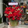 Hoa hồng đỏ giữ vai trò trung tâm, được chọn lựa kỹ về độ nở và màu sắc đồng đều, tạo nên một “khối cảm xúc” mạnh mẽ. Xen giữa là tiểu tú cầu với cấu trúc tròn mềm, giúp cân bằng tổng thể và tạo độ chuyển mượt mà giữa các tầng hoa.