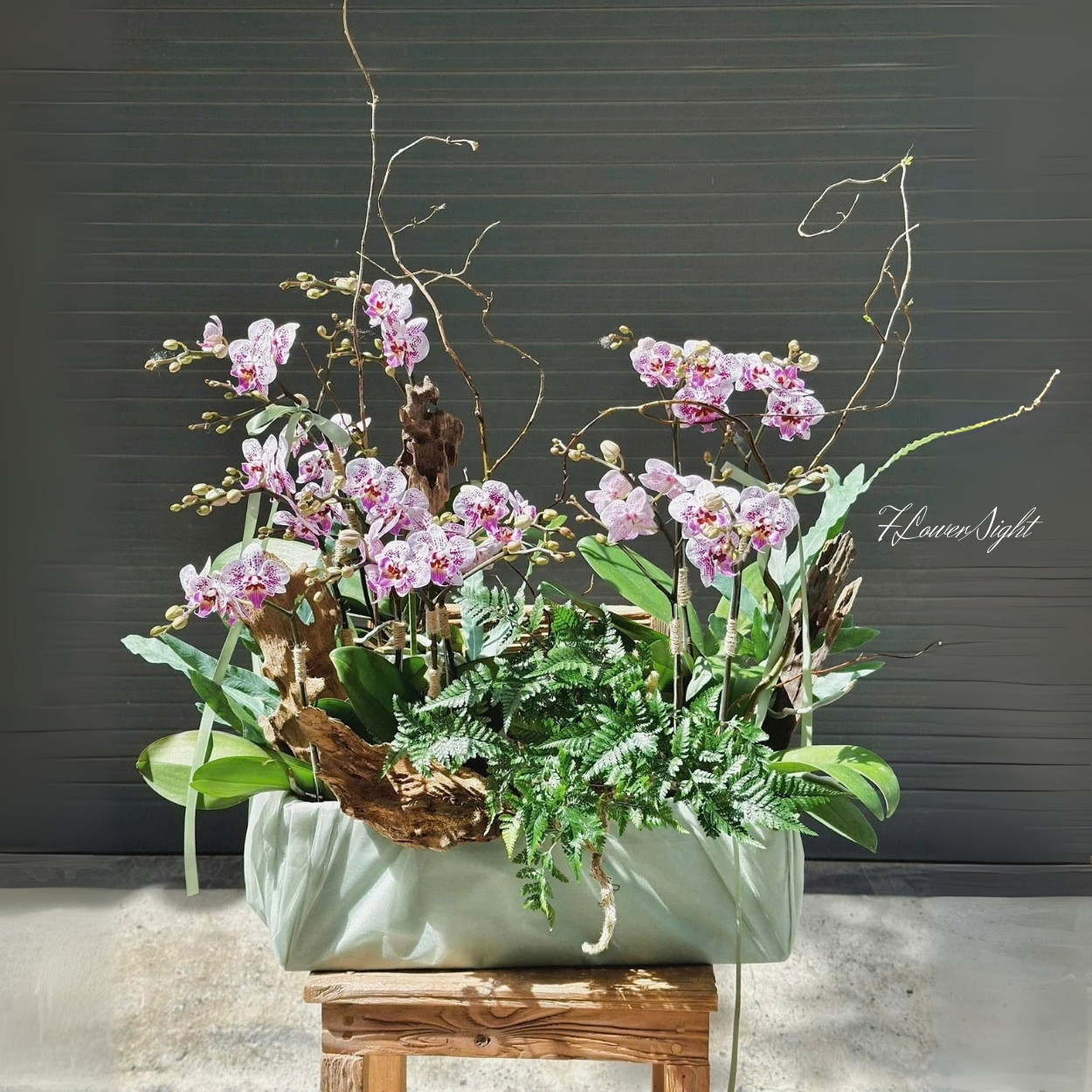 Tên gọi Present vừa gợi nhắc đến hiện tại, vừa mang ý nghĩa là quà tặng trân quý. Chậu hoa được thiết kế với lan vươn cao kiêu hãnh, dương xỉ xanh mát và lũa mộc mạc, hài hòa cùng sắc mềm mại của vải lụa. Sự phối hợp này tạo nên vẻ ngoài độc đáo, tinh tế nhưng vẫn giữ được nét gần gũi.