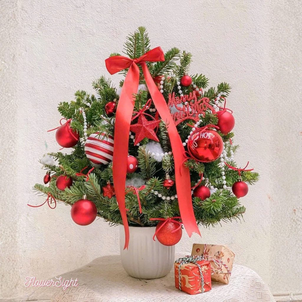 Nếu bạn muốn một góc Noel “bùng nổ cảm xúc” nhưng không chiếm diện tích, “Price Tag” là câu trả lời. Tán thông xanh mướt ôm trọn bảng màu đỏ – trắng kinh điển, trái châu bóng loáng phản chiếu ánh đèn, dây ngọc và bông gòn như sương tuyết đầu mùa, tất cả neo lại bằng chiếc nơ lụa đỏ ở đỉnh – khoảnh khắc Giáng Sinh được đóng khung trong một dáng cây nhỏ gọn, sang và cực kỳ “ăn hình”.