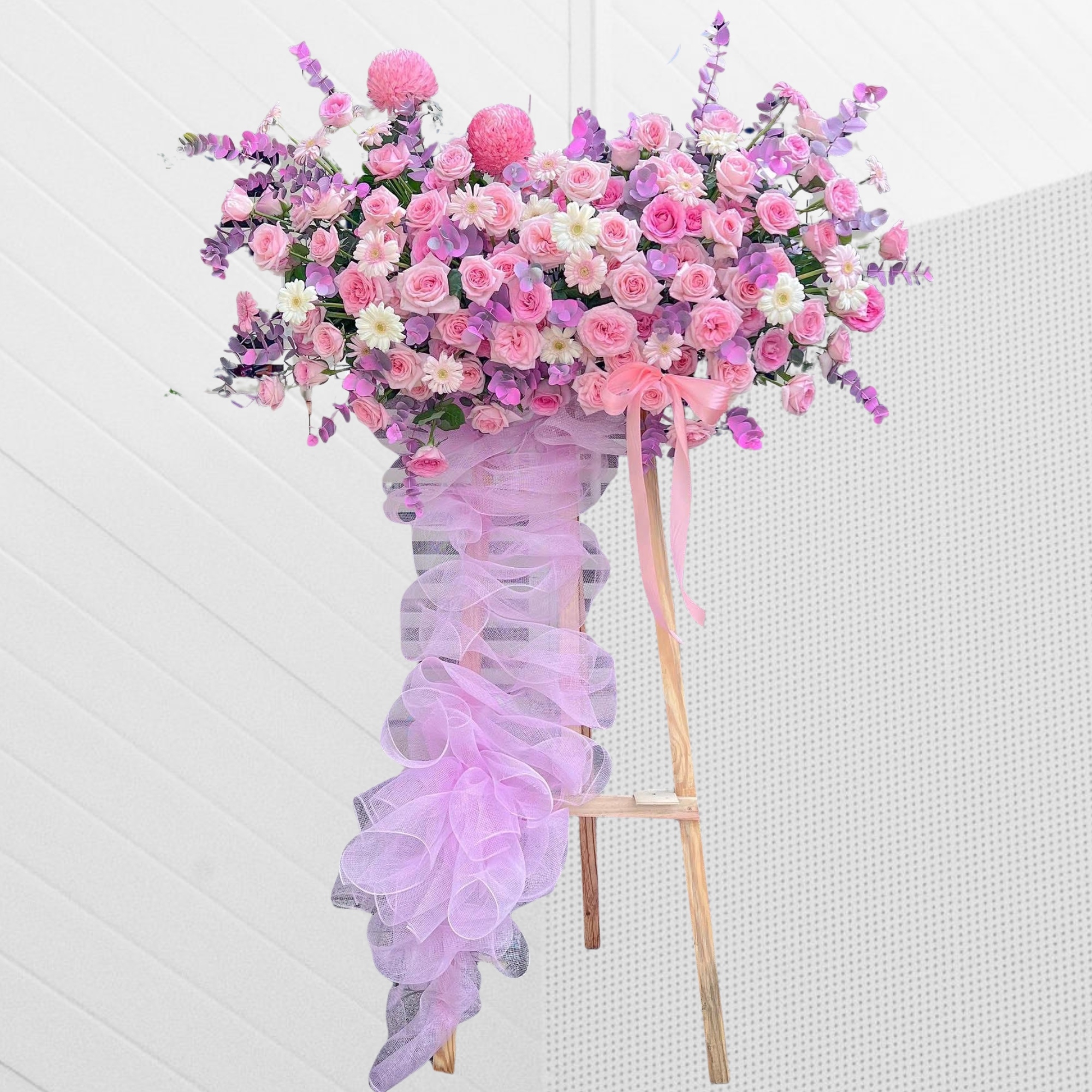 Các nhánh lá bạc và hoa phụ tím được cắm vươn cao, tạo hiệu ứng chuyển động tự nhiên, khiến kệ hoa không bị tĩnh mà luôn có cảm giác “đang sống”. Lớp lưới hồng phủ nhẹ phía trước cùng chiếc nơ mềm mại hoàn thiện tổng thể bằng một nét chấm phá nữ tính nhưng không kém phần sang trọng.