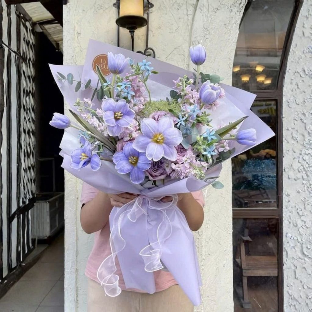 Sắc tím lilac của Radio gợi cảm giác bình yên, dịu mát và có chút mộng mơ. Tulip mang vẻ chuẩn mực, sao xanh đem lại nét tươi tắn, phi yến cho độ bay, lá bạc thêm hơi thở hiện đại. Đặt Radio trên bàn làm việc, ở góc phòng hay trong một khung hình kỷ niệm, bạn sẽ thấy không gian lập tức dịu xuống, ánh nhìn được kéo về trung tâm, tâm trạng cũng nhẹ hẳn đi. Đây là kiểu bó hoa không cần nhiều lời giải thích. Chỉ cần đứng yên là đủ kể một câu chuyện về gu thẩm mỹ và sự chăm chút của người tặng.