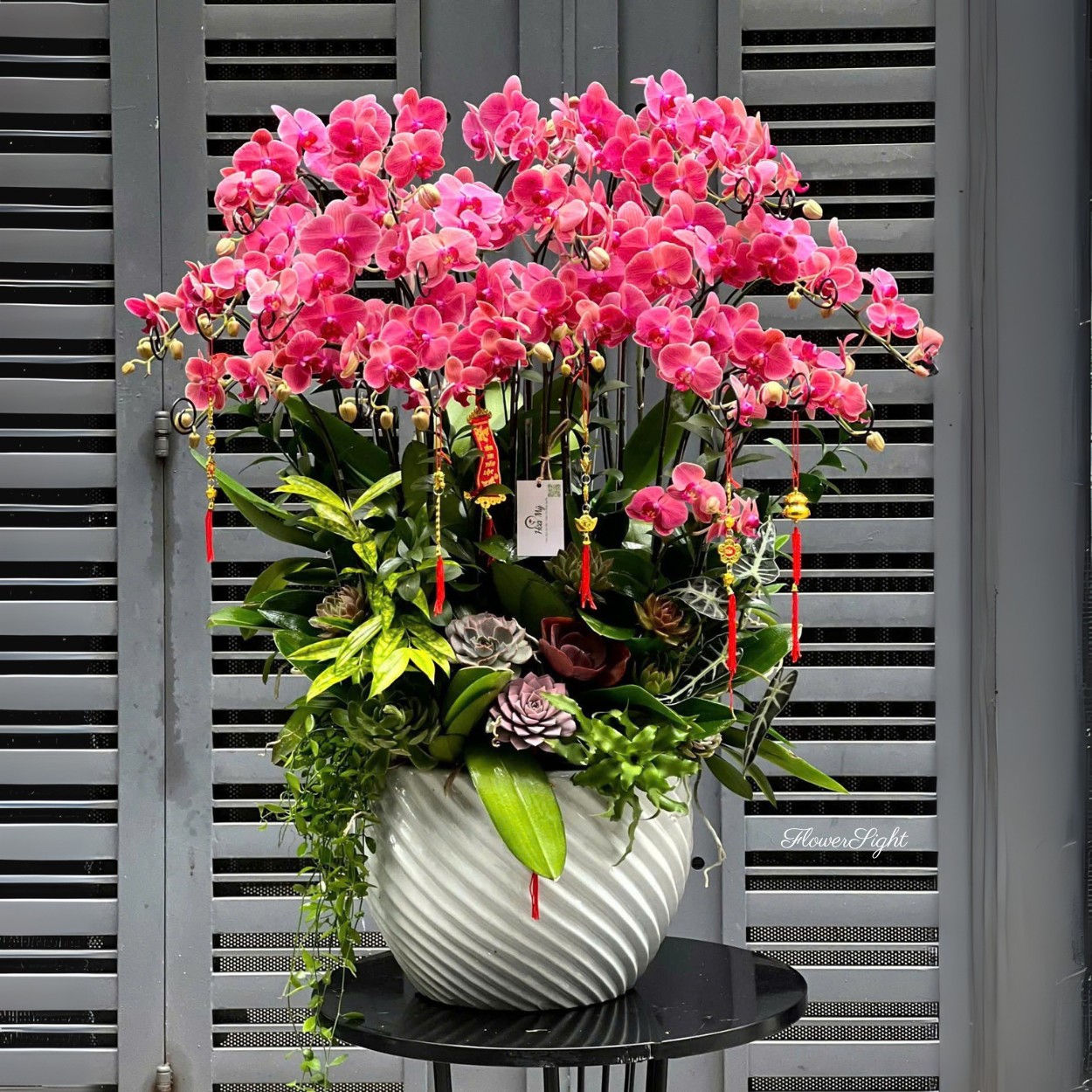 Chậu lan mang nét sang trọng, trang nhã, là lựa chọn lý tưởng khi biếu sếp trong dịp đặc biệt. Sự kết hợp hài hòa của màu sắc cùng khánh treo gợi nhắc lời chúc công việc suôn sẻ, phát triển thuận lợi. Đây là món quà tinh tế, vừa thể hiện sự kính trọng vừa tạo ấn tượng tốt đẹp nơi người nhận.