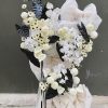 Điểm cuốn hút của Reweave nằm ở cách hoa được “dệt” theo tầng: phần trên mở rộng như một vòng tay ôm, phần giữa đổ xuống nhẹ như dòng chảy. Lan hồ điệp trắng được thả theo nhịp rủ tự nhiên, tạo cảm giác thanh thoát và sang. Xen kẽ là cúc mẫu đơn (dáng tròn, bông dày) mang vẻ đầy đặn, giúp khung hình chắc chắn hơn mà vẫn mềm. Hoa đồng tiền trắng được đặt rải có chủ đích để “bắt sáng”, khiến tổng thể không bị lạnh, mà trở nên ấm và gần.