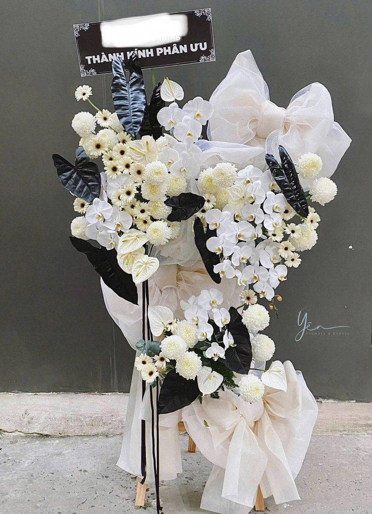 Các mảng lá môn sẫm màu là chủ ý thiết kế: vừa tạo nền, vừa làm nổi hoa trắng, lại gợi sự tĩnh tại rất đúng tinh thần kệ tang hiện đại. Toàn bộ được đặt trên kệ gỗ chắc chắn, dáng cao vừa phải, cân đối khi đặt ở nhà tang lễ hay không gian tiễn biệt.