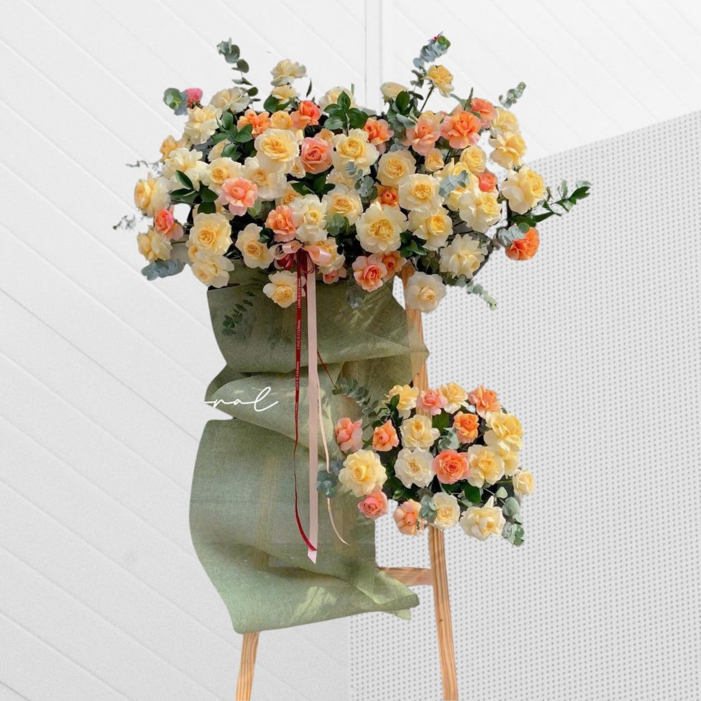 Điểm nổi bật của “Rise to Success” nằm ở thiết kế hai tầng có độ mở thoáng, tạo cảm giác như hoa đang vươn lên tự nhiên. Phần chính được tạo hình dày dặn với những bông hồng Beatric gam vàng kem và cam đào xen kẽ, mang đến hiệu ứng chuyển màu mềm mại, không gắt nhưng đủ thu hút.