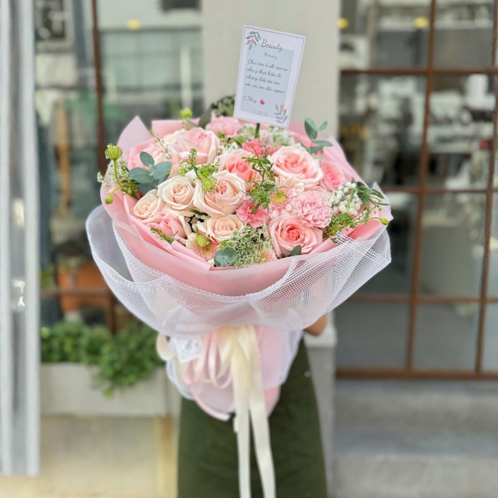 Có những bó hoa không cần rực rỡ để gây ấn tượng, vì cảm giác mà nó mang lại mới là điều ở lại lâu nhất. “Romance” là một bó hoa tặng mẹ như thế: mềm mại, thanh thoát và sạch sẽ trong từng mảng màu. Tổng thể là sắc hồng phấn nhẹ, điểm chút xanh mát của lá, tạo cảm giác vừa nâng niu vừa an yên – giống như khi mình đứng cạnh mẹ, không cần nói nhiều nhưng vẫn thấy đủ đầy.
