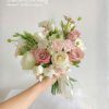 Ngoài ra, sự hiện diện của cỏ suối và nơ cũng làm nổi bật tổng thể, tạo nên một bó hoa cưới hoàn mỹ, sang trọng nhưng đầy ý nghĩa. Tất cả các thành phần này được sắp xếp khéo léo, mang lại một tổng thể tinh tế và trang nhã.
