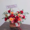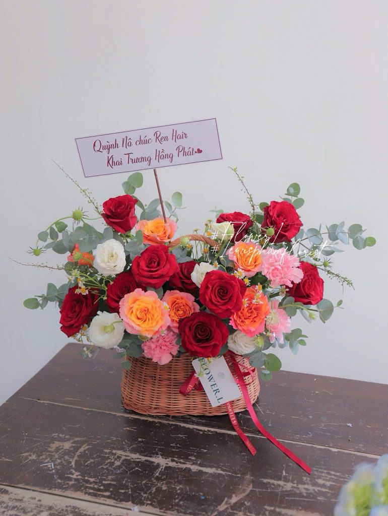 Tổng thể giỏ hoa là sự kết hợp hài hòa giữa sắc đỏ nồng cháy và cam ấm áp, tạo nên cảm giác vừa mạnh mẽ vừa gần gũi. Thiết kế mở, tự nhiên nhưng có kiểm soát giúp từng bông hoa đều nổi bật mà vẫn giữ được sự cân đối, sang trọng.