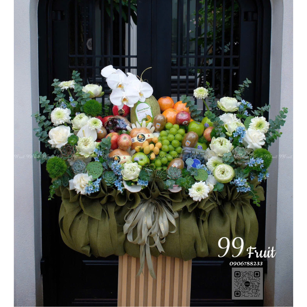 - Tùy chỉnh: thay đổi tông hoa (trắng kem/nhạt xanh), đổi loại quả theo mùa hoặc bổ sung thiệp – bảng tên theo nhận diện thương hiệu khách hàng.