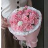Cẩm chướng hồng là điểm nhấn chính của bó hoa. Những cánh hoa xếp lớp mềm mại, tạo cảm giác đầy đặn nhưng vẫn rất nhẹ nhàng. Màu hồng không quá đậm, thiên về sắc pastel, mang lại cảm giác dễ chịu và gần gũi.