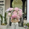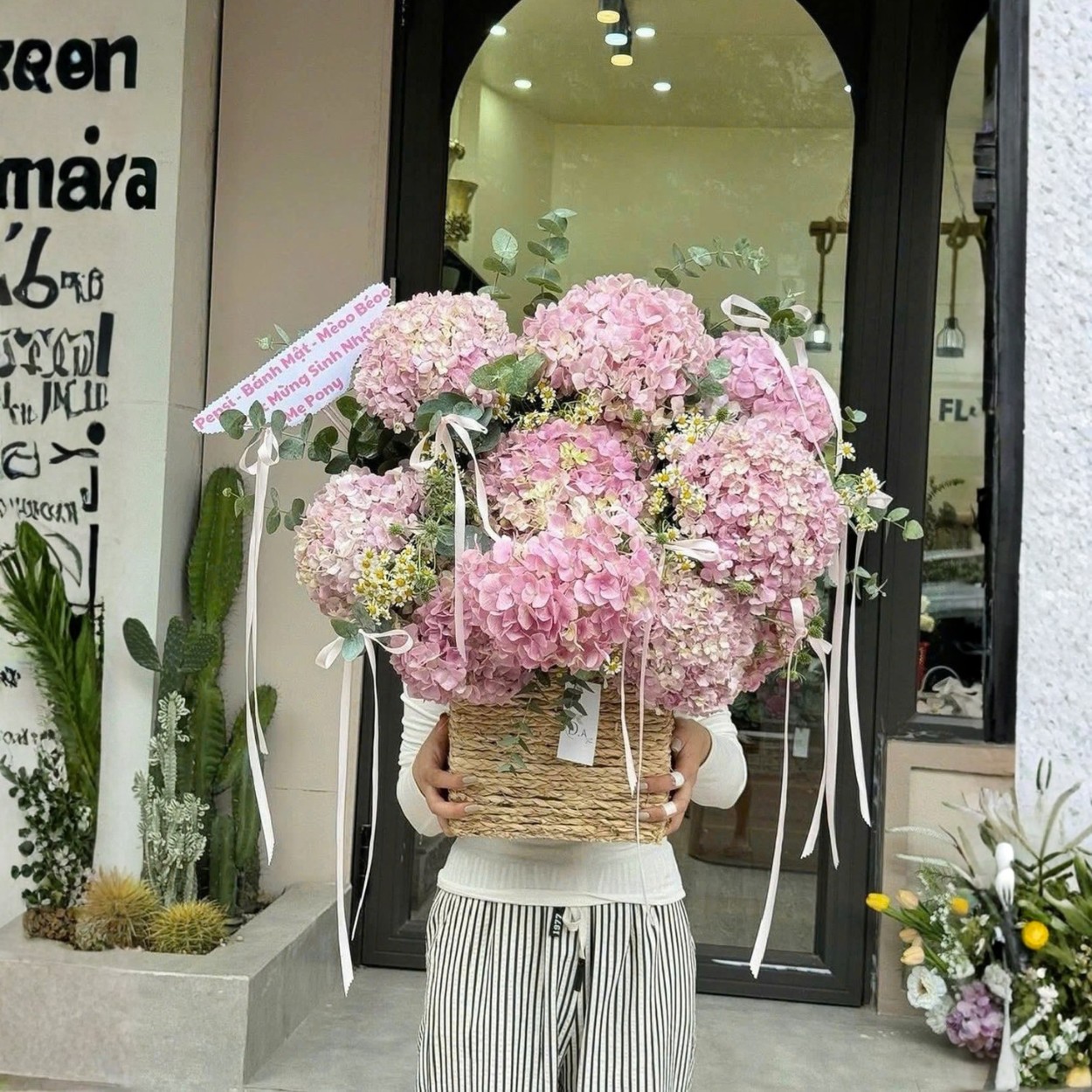 Có những thiết kế không cần rực rỡ để gây ấn tượng. “Say giấc nồng” thuộc dòng giỏ hoa cẩm tú cầu là kiểu hoa như vậy: chỉ một gam hồng phấn, thêm vài chấm trắng nhỏ xíu và chút xanh mát của lá, thế là đủ tạo ra cảm giác êm, sạch và sang—kiểu sang “không cố gắng”, chỉ cần nhìn đã thấy tâm trạng chậm lại.
