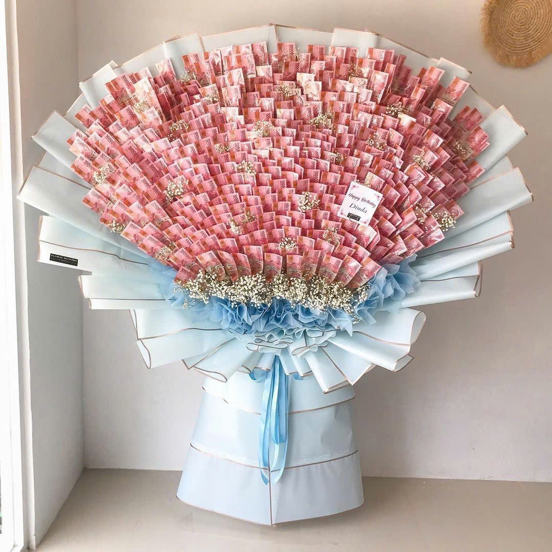 Và để tổng thể không bị “cứng” vì các nếp tiền, hoa baby trắng được cài rải khéo léo. Baby giống như những chấm sáng li ti, làm bó hoa nhẹ hơn, trong trẻo hơn, và giúp từng lớp tiền trông mềm mại, có chiều sâu.