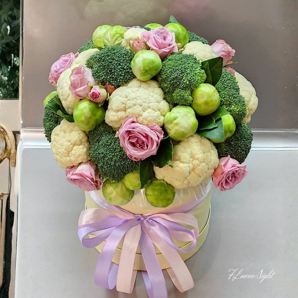 Mở hộp là cảm giác mát lành và rất sống động. Những mảng xanh của lơ và bắp cải cho cảm giác khỏe khoắn còn hoa hồng phấn mang lại sự dịu dàng. Bó hoa trái cây này phù hợp cho ai yêu thích vẻ đẹp tối giản nhưng vẫn muốn có điểm nhấn thị giác rõ ràng. Nhờ kết cấu chắc tay, khối hoa giữ dáng tốt trên bàn làm việc quầy lễ tân hay góc phòng khách.