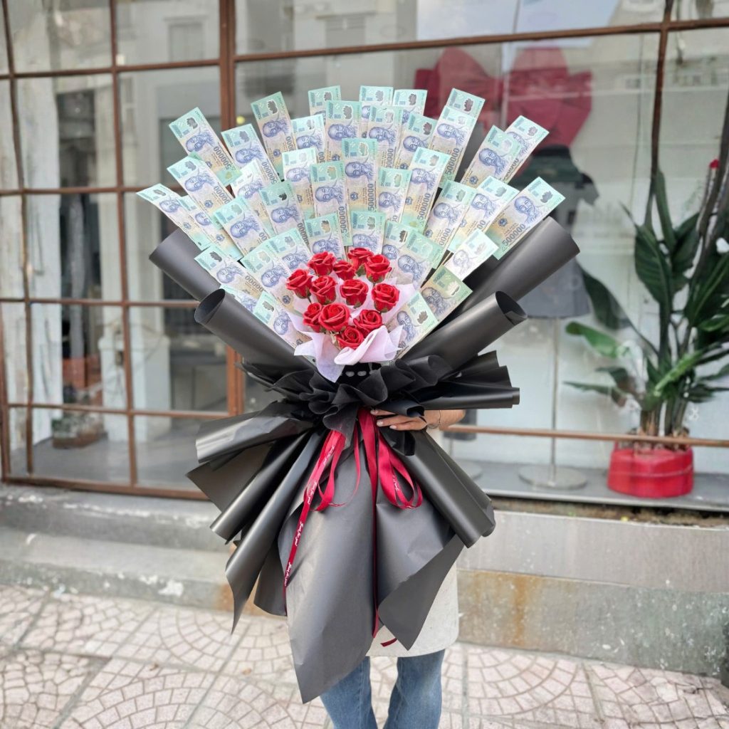 Bó hoa tiền “Shark” là một thiết kế đặc biệt dành cho những ai yêu thích sự khác biệt và phong thái tự tin. Không mang vẻ mềm mại hay ngọt ngào thường thấy, “Shark” là sự kết hợp độc đáo giữa tiền mệnh giá 500.000 đồng được gấp tỉ mỉ thành từng lớp cánh hoa, điểm xuyết trên nền giấy gói tông đen chủ đạo – một màu sắc gợi lên quyền lực, sự bí ẩn và tinh tế.