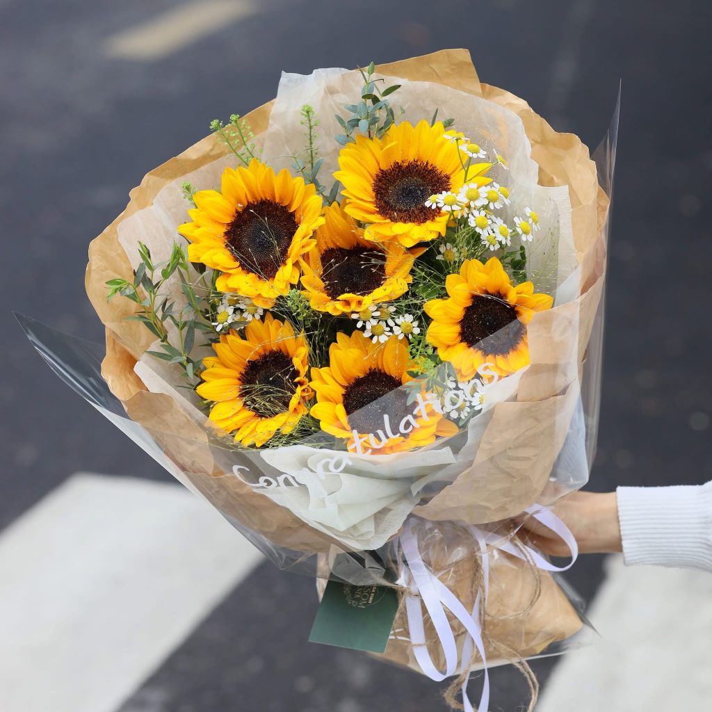 Sắc vàng rực rỡ của hoa hướng dương như ánh nắng cuối ngày trên sân trường, vừa ấm áp, vừa mạnh mẽ. Xen kẽ giữa đó là những chùm cúc tana trắng nhỏ xinh, mang đến cảm giác nhẹ nhàng, cân bằng và đầy tinh tế. Tất cả được gói gọn trong lớp giấy kraft tự nhiên, kết hợp cùng nơ buộc thanh lịch, tạo nên tổng thể vừa gần gũi vừa hiện đại.