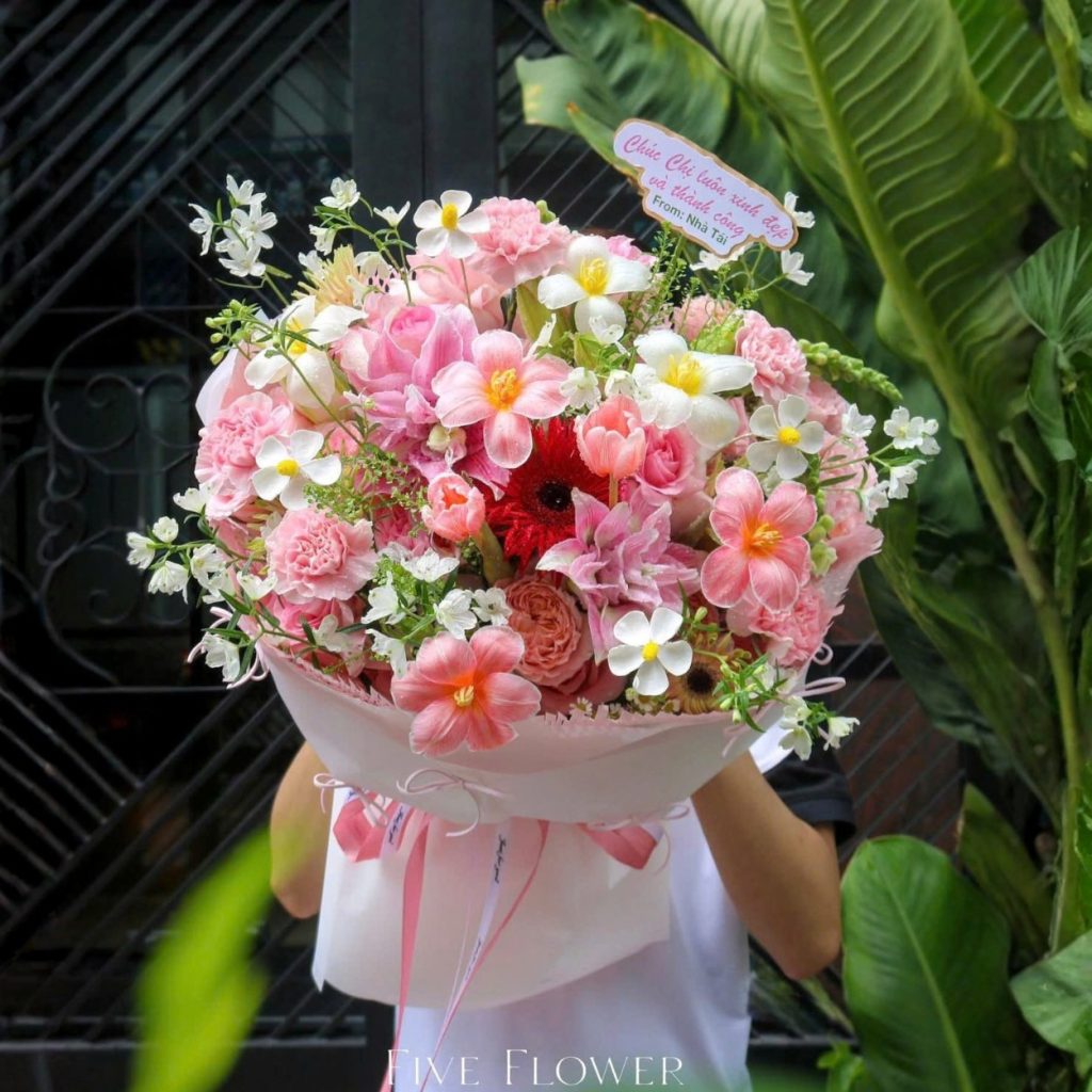 Tông màu hồng phấn chủ đạo được phối khéo với sắc trắng trong trẻo, tạo nên tổng thể hài hòa, không phô trương nhưng đủ nổi bật. Đây là bó hoa dành cho những ai yêu vẻ đẹp tinh tế, sâu lắng và có chiều sâu cảm xúc.