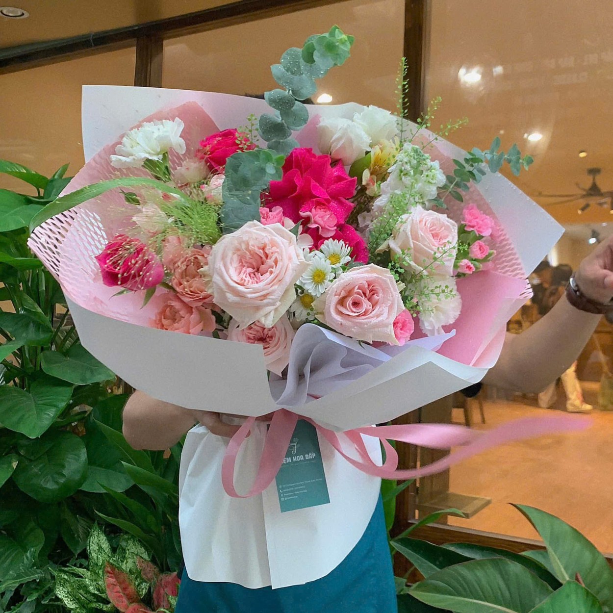 Không thể thiếu lá bạc eucalyptus – lớp nền xanh xám mờ tạo độ thoáng và cân bằng sắc độ, giúp các gam hồng nổi bật hơn mà không bị gắt. Tất cả được bao bọc bởi giấy gói tone trắng – hồng pastel, kết hợp nơ mềm thắt nhẹ, hoàn thiện vẻ ngoài thanh lịch và tinh tế.
