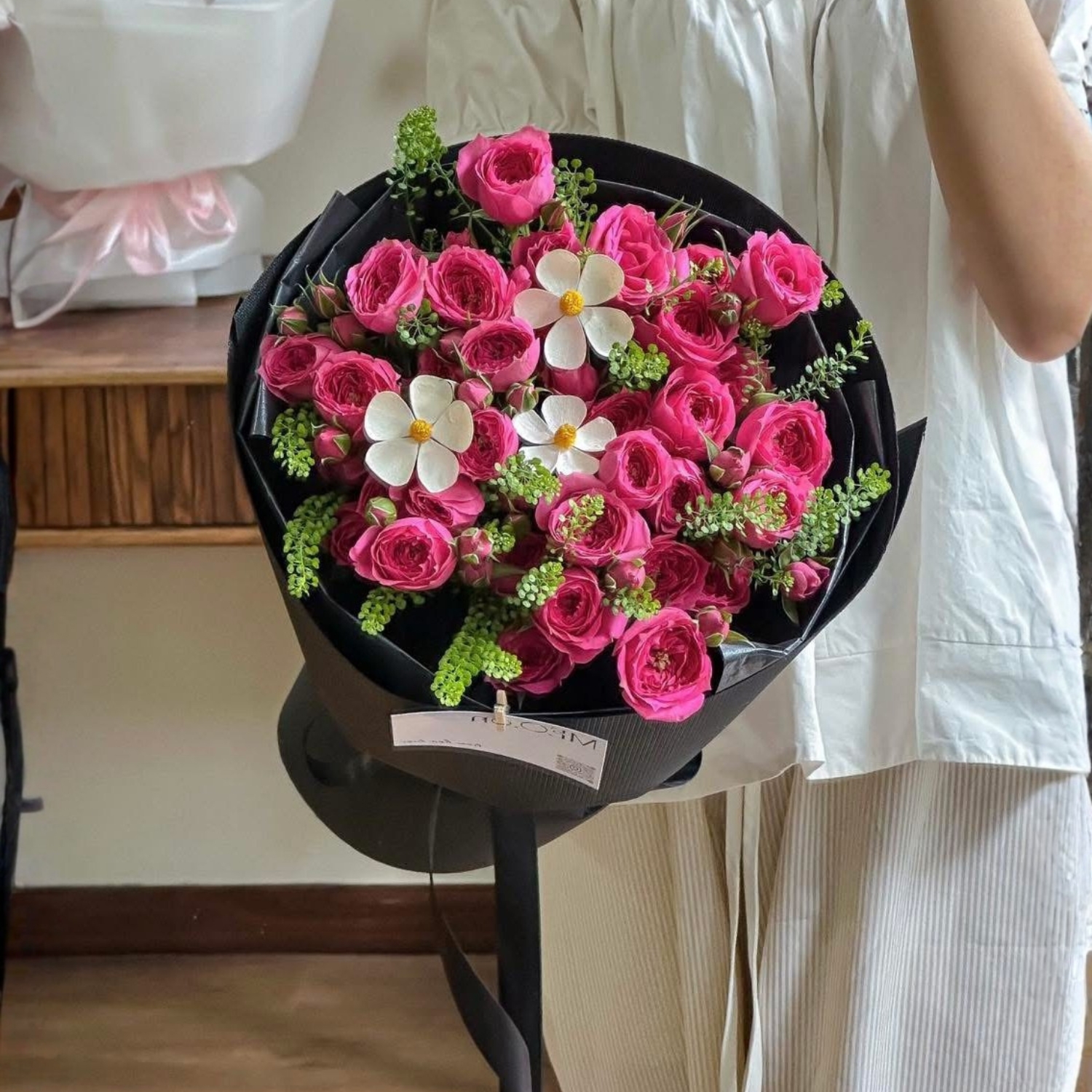 Bó hoa này không chỉ là một món quà sinh nhật mà còn là biểu tượng của sự yêu thương và tôn trọng. Sự kết hợp của hoa hồng, hoa cúc gỗ và cỏ đồng tiền tạo nên một tổng thể hài hòa, vừa mang tính nghệ thuật, vừa thể hiện được cái nhìn tinh tế và sang trọng.