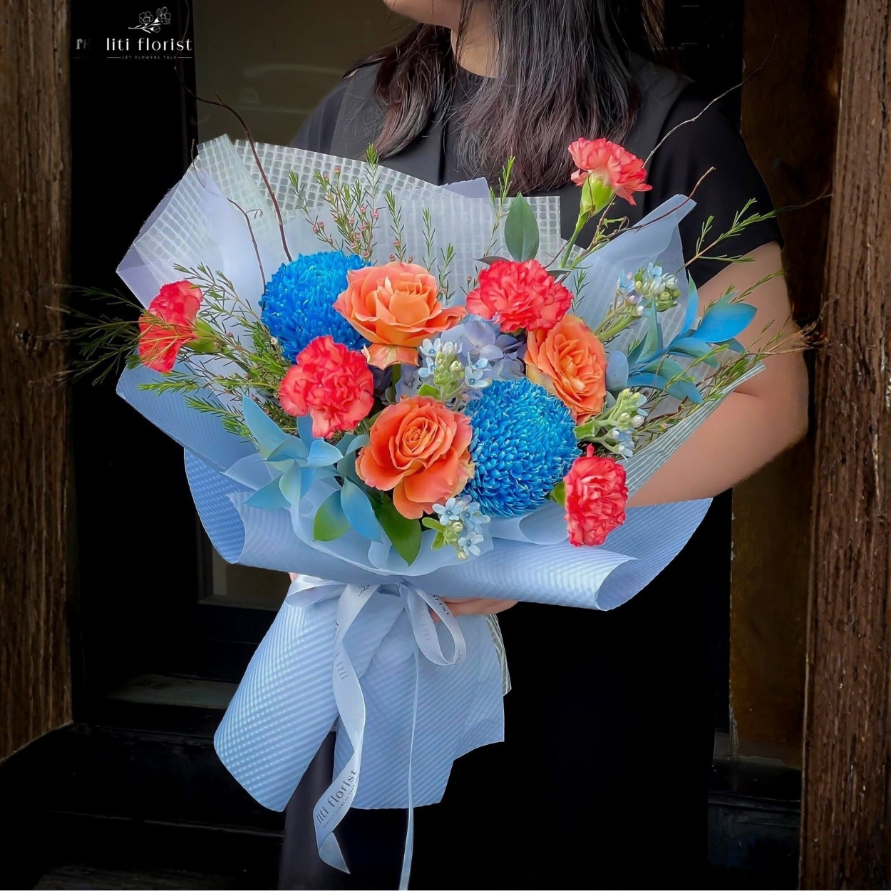 Bó hoa “Solid Rock” được thiết kế đặc biệt để mang lại sự ấn tượng và không thể nhầm lẫn với bất kỳ món quà nào khác. Hoa hồng quốc vương với sắc đỏ nồng nàn tượng trưng cho tình yêu mãnh liệt và vĩnh cửu. Cúc mẫu đơn, cẩm chướng và sao xanh góp phần tạo nên một không gian hoa ngập tràn sức sống, nhẹ nhàng nhưng không kém phần cuốn hút. Sự kết hợp giữa thanh liễu mềm mại và lá phụ trợ giúp làm nổi bật sự tươi mới và thanh thoát của các loài hoa chính.
