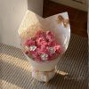 Lớp giấy gói cũng là một phần quan trọng của thiết kế. Giấy xơ mỏng tông ngà ở lớp trong tạo hiệu ứng mềm như sương, kết hợp cùng lớp giấy trắng kem bên ngoài giúp bó hoa giữ được nét sang nhưng không hề lạnh. Phần nơ sợi mộc trên miệng bó và chân bó giống như một chi tiết thủ công nhỏ, vừa xinh vừa duyên, làm cho tổng thể trở nên gần gũi hơn. Khi đặt dưới ánh sáng tự nhiên, sắc hồng của hoa càng dịu, nền giấy càng ấm, khiến cả bó hoa mang đúng tinh thần của tên gọi: trong trẻo, nhẹ tay và có chút thơ.