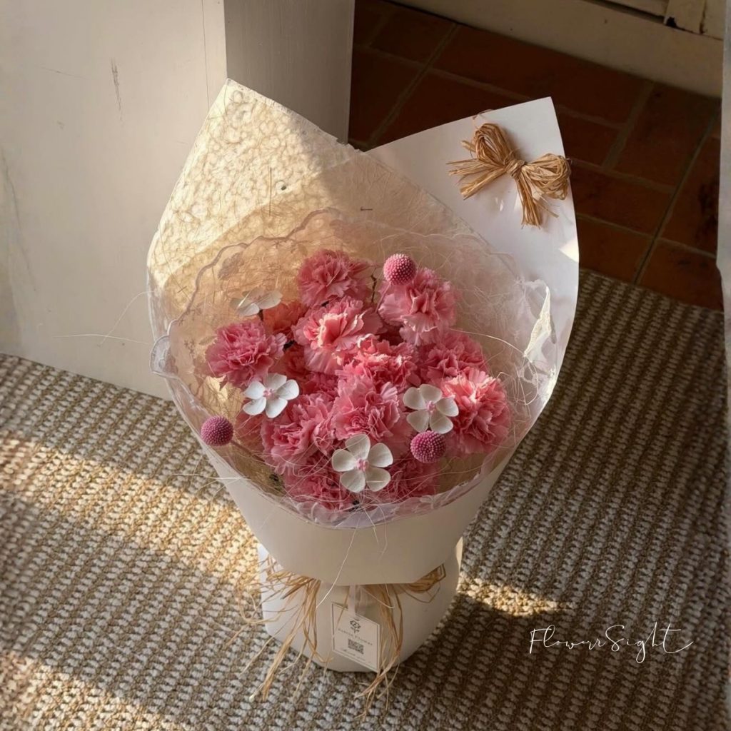 Không phải ai cũng thích những bó hoa thật lớn hay màu sắc thật chói. Có những người chỉ cần một thiết kế vừa tay, phối màu tinh tế và mang lại cảm giác được thấu hiểu. “Sớm Mai Dịu Dàng” dành cho kiểu rung động ấy. Sắc hồng của cẩm chướng gợi sự quan tâm, ngọt ngào và nét nữ tính rất vừa phải; cúc gỗ mang đến cảm giác trong trẻo; còn cúc nút thêm vào chút vui tươi, trẻ trung. Mọi chi tiết đứng cạnh nhau tạo nên một bó hoa có cảm xúc, chứ không chỉ đẹp về hình thức.
