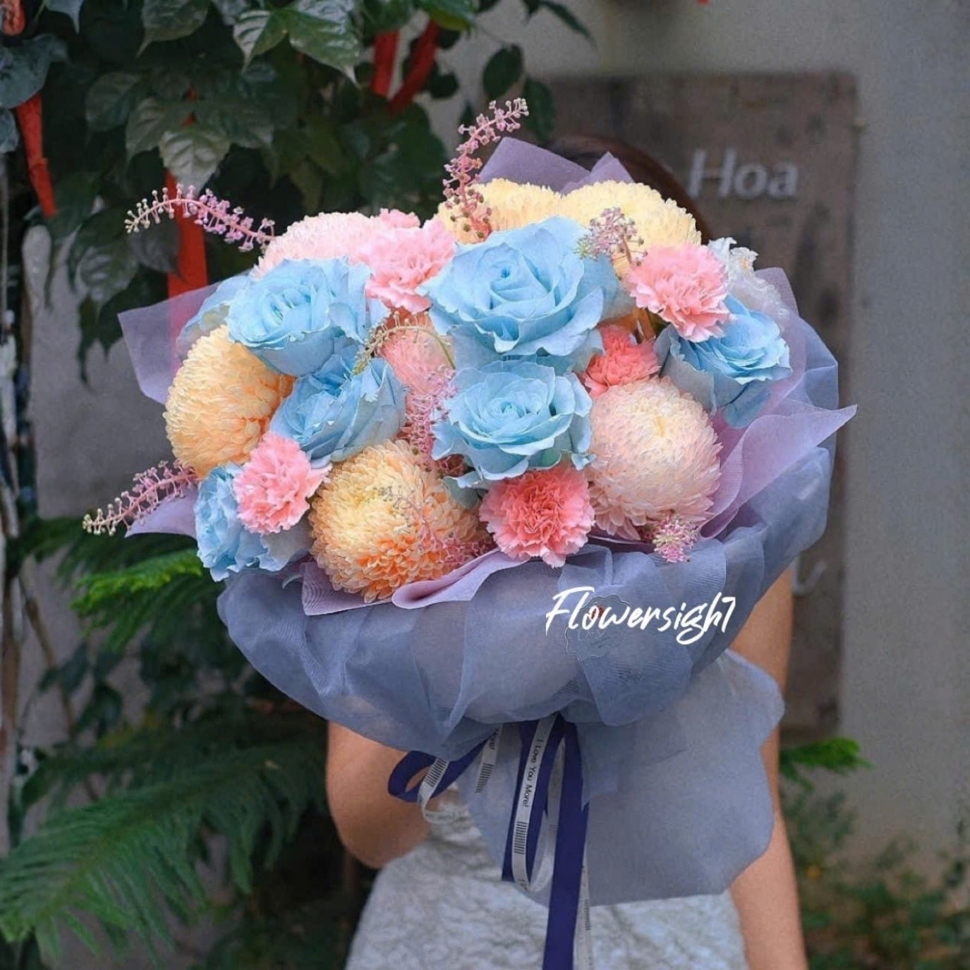 Có những điều ta muốn nói với mẹ, nhưng càng lớn lại càng ngại. “Sometime Ago” được tạo ra cho những khoảnh khắc như vậy: không ồn ào, không phô trương, chỉ là một cảm giác êm dịu chạm vào tim. Tổng thể bó hoa là gam pastel mát lành: những đóa hoa hồng xanh nổi bật như điểm bình yên, đi cùng cúc mẫu đơn tròn đầy ở sắc kem – đào phấn, và cẩm chướng hồng rải đều như những lời thì thầm “con thương mẹ”.