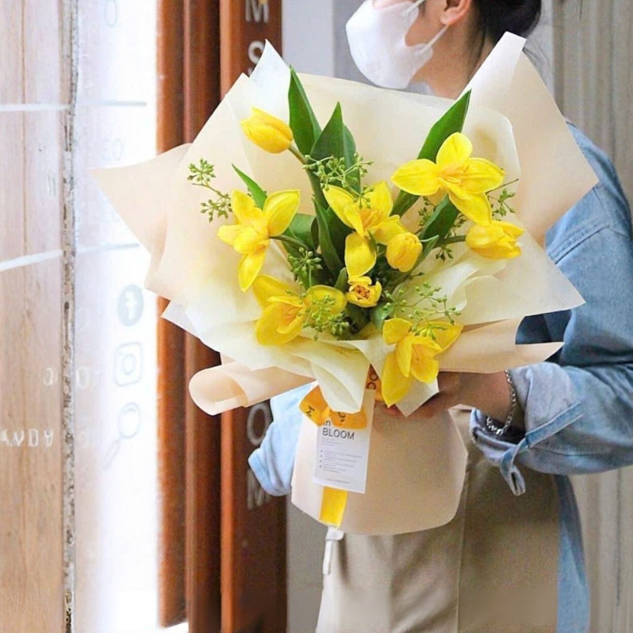Ngay khi chạm mắt, “Sơn thủy” cho cảm giác như một bức họa mở ra buổi sớm trong vắt. Những bông tulip vàng căng mọng là điểm sáng trung tâm, vươn nhẹ qua các lớp giấy gói màu kem và nude xếp bồng bềnh. Lá xanh dựng trụ tạo nhịp điệu lên xuống như đường núi và đồi thoải, xen lẫn vài chồi non và nụ mảnh mai gợi hình giọt sương đầu ngày. Một dải nơ vàng ấm kết lại tổng thể, giữ cho bó hoa gọn gàng và tinh tươm khi trao tay.