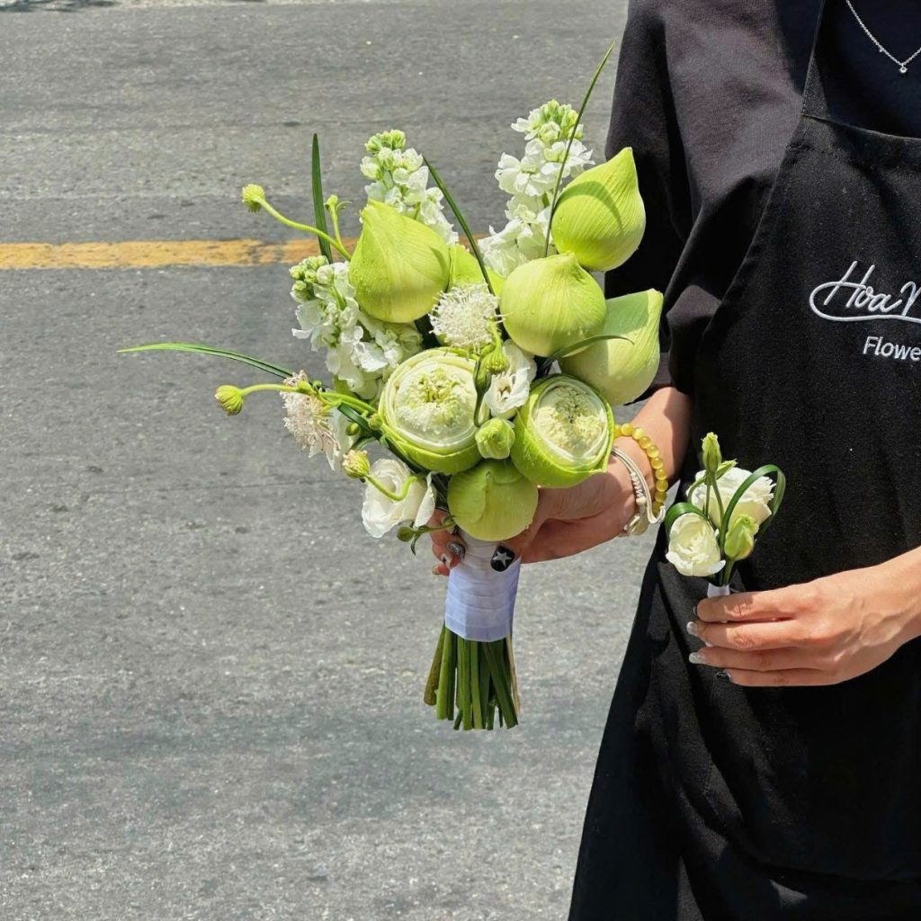 Hoa cưới cầm tay Sóng tình đặc biệt “hợp gu” với những cô dâu yêu phong cách thanh lịch, thích sự giản lược nhưng không đơn điệu. Bó hoa sen xanh – trắng giúp tôn làn da, làm nổi bật đường nét váy cưới mà không chiếm spotlight, để cô dâu vẫn là nhân vật chính trong từng khung hình.Nhờ bố cục gọn, chắc tay, cô dâu có thể thoải mái di chuyển, bước đi trên lễ đường hay chụp ảnh ngoài trời mà không lo hoa bị xô lệch. Màu sắc trung tính của Sóng tình cũng rất “ăn ảnh” dưới nắng, trên phố hay trong không gian tiệc cưới, giúp bộ ảnh cưới mang hơi thở hiện đại nhưng vẫn đậm nét Á Đông.