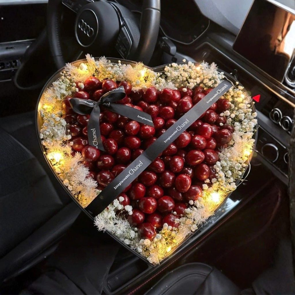 Sofia Quinn là kiểu quà “đánh trúng trái tim ngay từ cái nhìn đầu tiên”. Bề mặt quả cherry đỏ bóng được xếp kín bề mặt hộp trái tim, ôm viền là một “đám mây” baby trắng và lớp đèn vàng ấm áp. Tất cả gói trong chiếc hộp tone đen sang trọng, buộc nơ satin bản lớn, tạo nên cảm giác hiện đại, tinh tế và rất “photogenic”. Đây là kiểu giỏ hoa trái cây không cần lời giới thiệu dài – chỉ cần mở nắp, ánh sáng phản chiếu lên hạt cherry là đủ nói thay mọi tâm ý.