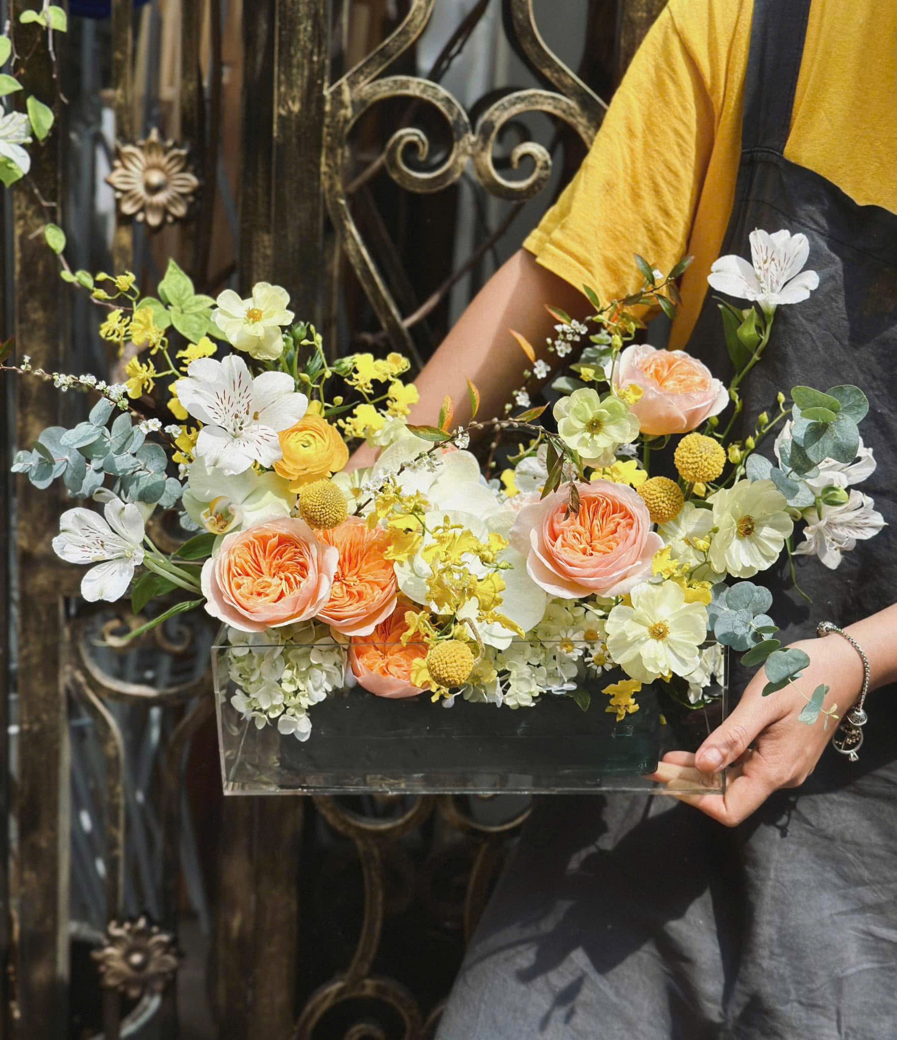 - Hoa hồng Juliet sắc cam đào sang trọng, cánh xếp dày, là điểm nhấn chính của toàn bộ thiết kế