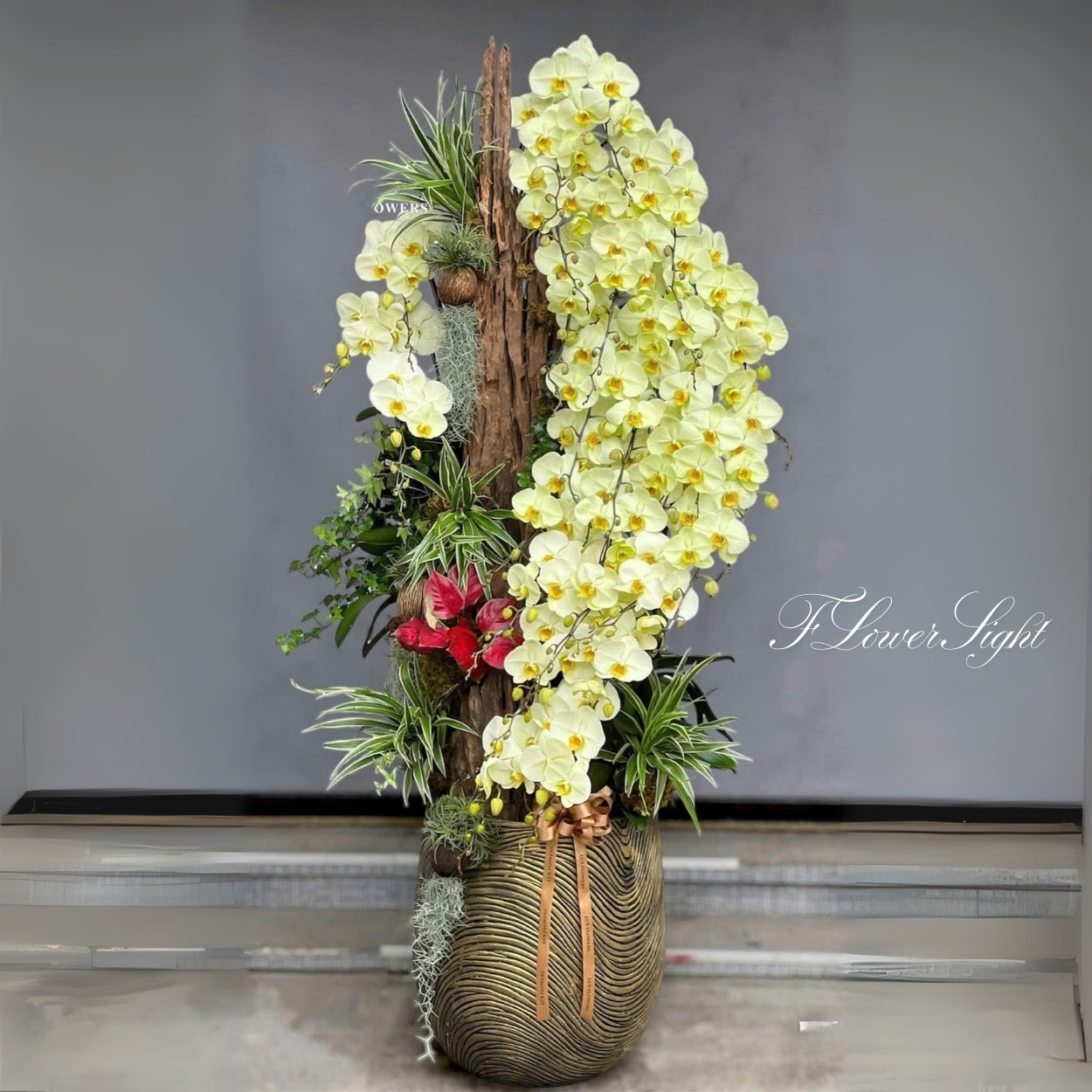Trong dịp khai trương, chậu lan đại diện cho thăng tiến và cơ hội mới. Sắc hoa tươi sáng, kết hợp tinh tế với lá thường xuân, lá nho và thân gỗ, mang đến vẻ đẹp sang trọng. Đây là món quà vừa ý nghĩa vừa đẳng cấp, thể hiện sự trân trọng và chúc cho công việc kinh doanh ngày càng phát triển.