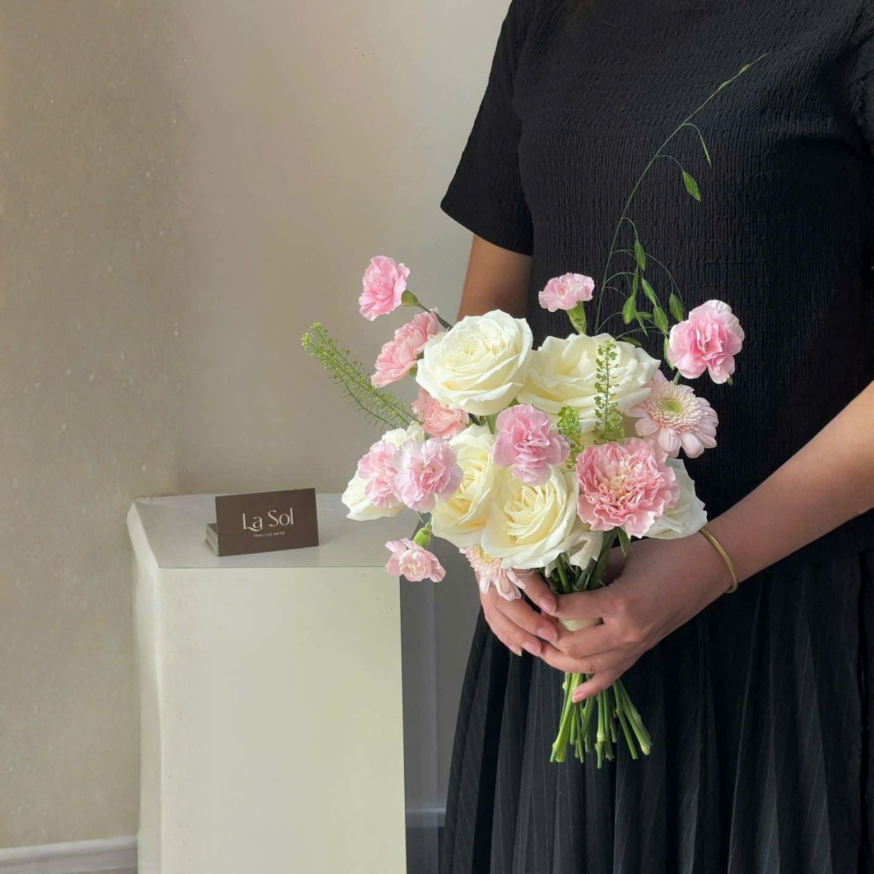Có những bó hoa không ồn ào, không phô trương, nhưng chỉ cần chạm mắt đã khiến ta cảm nhận được sự trọn vẹn. “Sự ưu tiên” chính là một bó hoa như thế: nhẹ nhàng, tinh sạch, nhưng đầy chủ đích. Từ sắc trắng mịn màng của hồng cho đến sắc hồng phớt mềm như hơi thở của cẩm chướng, mỗi cánh hoa đều như đang thì thầm một lời khẳng định: “Hôm nay, em là người được ưu tiên nhất.”Không cầu kỳ, không tầng tầng lớp lớp, thiết kế tập trung vào sự thoáng, tự nhiên và một nhịp điệu hoa rất mềm. Sự sắp đặt ấy tạo cảm giác cô dâu đang mang theo một đám mây nhẹ ôm trọn đôi tay, tinh tế nhưng vẫn đầy cảm xúc.