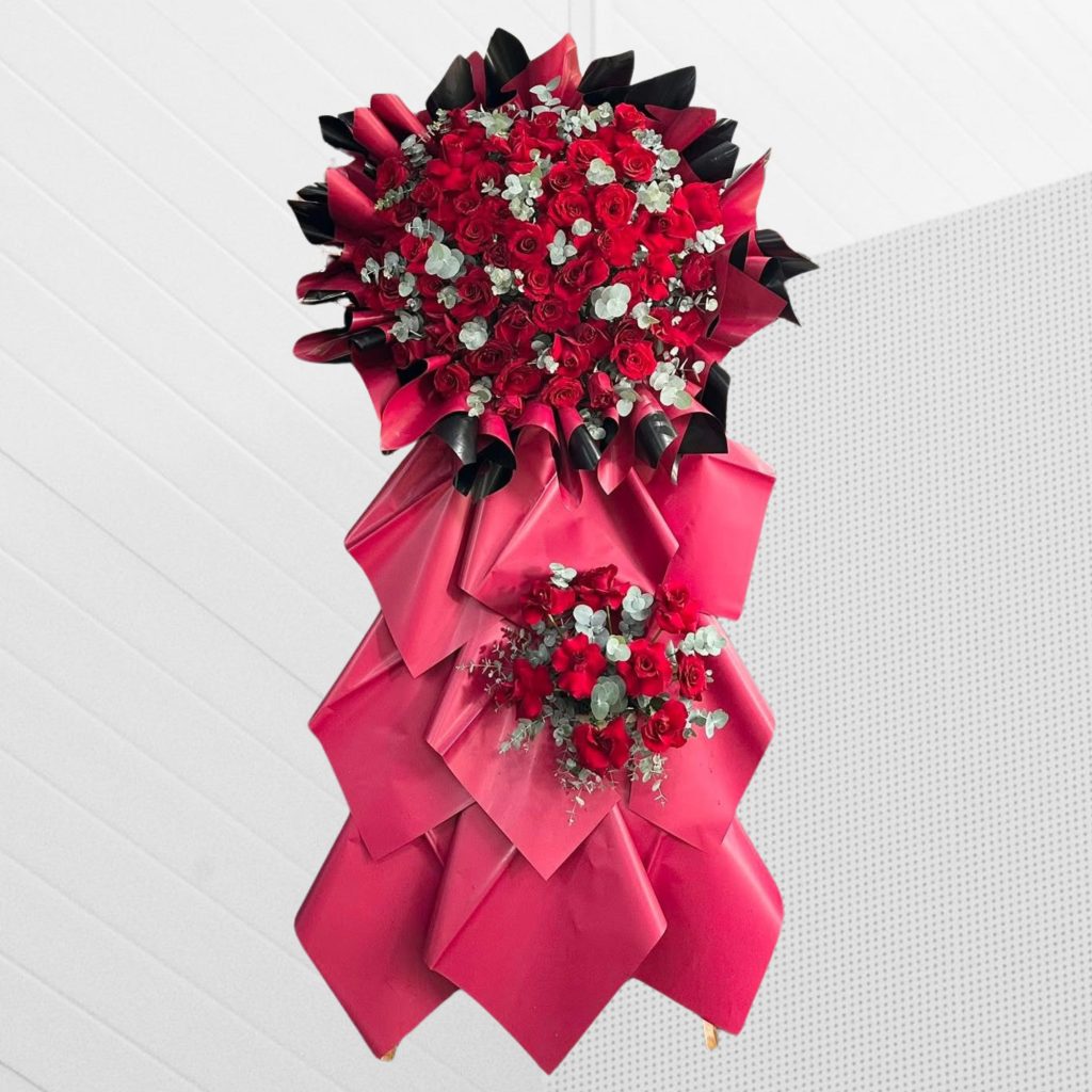 Không cần quá nhiều chi tiết cầu kỳ, Success & Abundance gây ấn tượng ngay từ ánh nhìn đầu tiên bằng sắc đỏ sâu cuốn hút, kết hợp cùng cấu trúc kệ vững vàng và bố cục hoa dày dặn. Đây không chỉ là một kệ hoa mừng khai trương, mà còn là một “tuyên ngôn thị giác” về sự thành công – nơi từng bông hoa như đang cùng nhau kể câu chuyện của một khởi đầu đầy kỳ vọng.