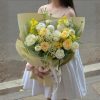 Gam màu vàng nhạt, trắng kem và xanh non được xử lý khéo léo, tạo nên một bố cục hài hòa, dễ nhìn và có chiều sâu. Bó hoa không chạy theo xu hướng cầu kỳ, mà tập trung vào cảm xúc: sự dễ chịu, tinh tế và tự nhiên.