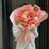 Phần giấy gói được xử lý nhiều lớp: lớp trong trắng mỏng giúp tôn hoa, lớp ngoài màu hồng tạo hiệu ứng bồng bềnh. Nơ buộc mềm mại, rũ nhẹ, không quá cứng form, giúp tổng thể giữ được sự tự nhiên và bay bổng.