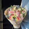 Tổng thể bó hoa mang sắc hồng phấn chủ đạo, đan xen trắng kem và điểm xanh nhạt, gợi liên tưởng đến ánh nắng mùa đông vừa đủ – không chói chang nhưng đủ làm lòng người mềm lại.