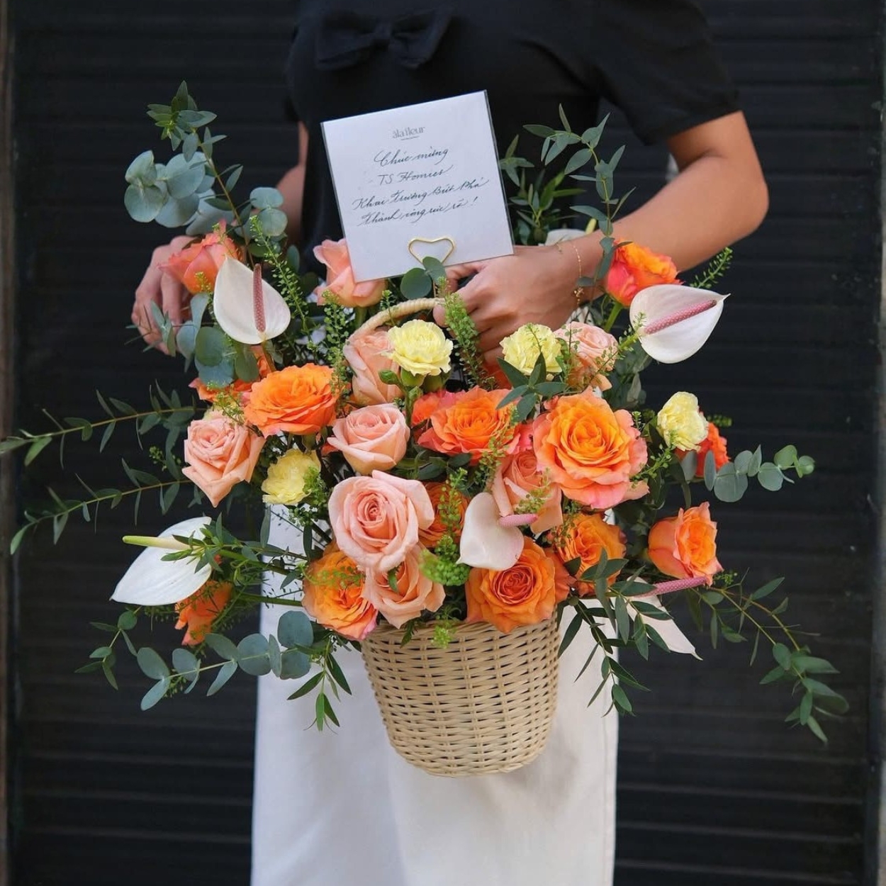 Bố cục của giỏ hoa được thiết kế theo kiểu dáng tự nhiên nhưng đầy nghệ thuật, giúp tạo nên vẻ đẹp vừa trang nhã, vừa lôi cuốn. Cách sắp xếp các loài hoa cùng phụ kiện cũng rất tinh tế, mang đến một hình ảnh tổng thể nhẹ nhàng nhưng không kém phần mạnh mẽ, phù hợp với phong cách của một người đàn ông.