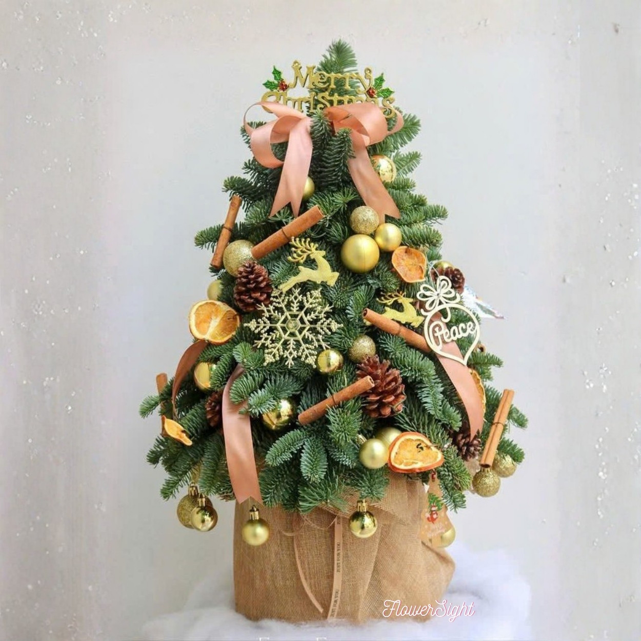 Surrender không ồn ào hay phô trương – đó là sự tĩnh lặng của một mùa Noel đủ đầy. Cây thông Noel tươi này được cắm thủ công từ những cành lá thông tươi xanh, điểm xuyết trái thông nâu tự nhiên, những lát cam sấy ấm áp và chùm trái châu ánh bạc, tất cả hòa quyện trong một tổng thể cân đối và gần gũi.