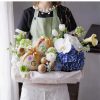 Điểm đặc biệt của thiết kế này nằm ở cách sắp đặt tự nhiên nhưng có chủ ý. Hoa không xếp theo khuôn cứng mà lan tỏa theo từng tầng, xen kẽ cùng trái cây, tạo cảm giác gần gũi như một khu vườn nhỏ được thu gọn trong chiếc giỏ vải mềm mại.